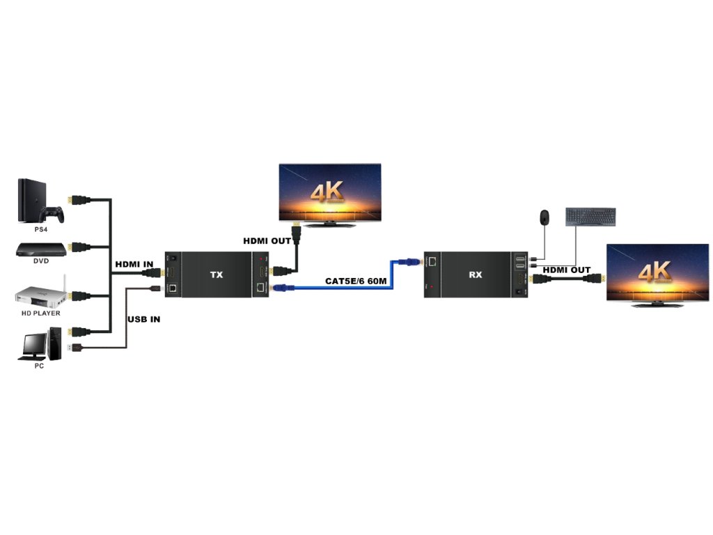 RX-H51060 je sada dvou aktivních převodníků, která umožňuje současný přenos HDMI obrazu a USB signálu po běžném UTP kabelu Cat.5e nebo Cat.6 na vzdálenost až 60 metrů.