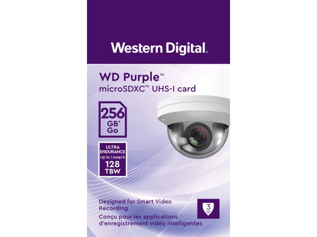 Paměťová karta MicroSDXC256GB WD Purple pro kamerové systémy, čtení 100MB/s, zápis 60MB/s, nepřetržitý záznam, vhodná pro venkovní kamery.